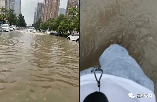 16點,紅圈運營團隊的幾名同事剛剛結(jié)束對一家客戶拜訪,正在前往另一家客戶的路上,此時雨水已經(jīng)淹沒膝蓋。