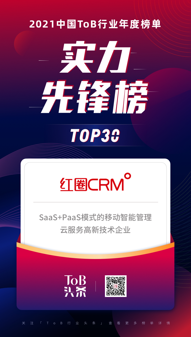 12月27日,「ToB行業(yè)頭條」聯(lián)手3W集團(tuán)正式發(fā)布了《2021ToB行業(yè)年度榜單·實(shí)力先鋒榜》,評選出了2021年ToB領(lǐng)域各賽道最具實(shí)力的先鋒企業(yè)TOP30。“和創(chuàng)科技(紅圈CRM)”作為數(shù)字化智能企業(yè)云服務(wù)領(lǐng)域的先鋒企業(yè),入選榜單行列!