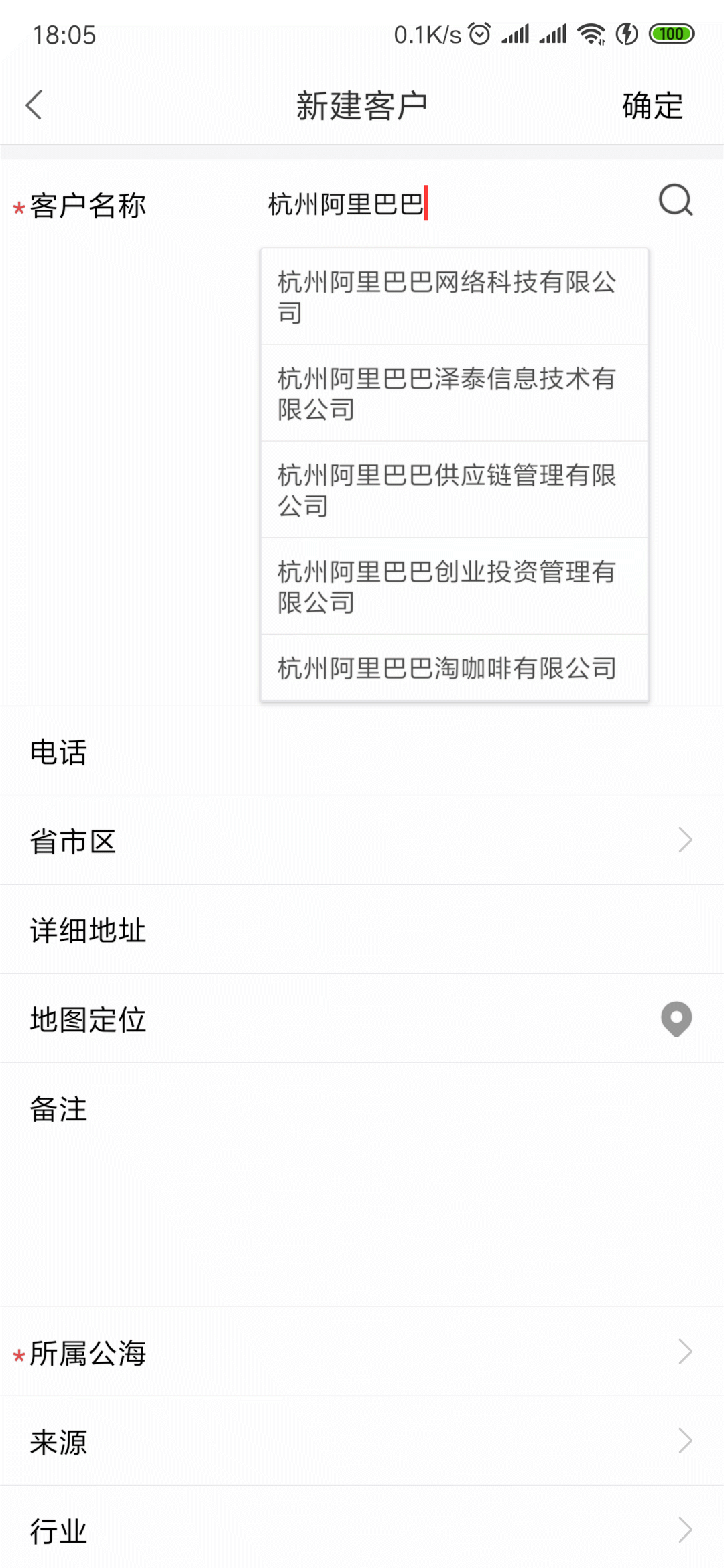 如輸入關(guān)鍵字“杭州阿里巴巴”后,系統(tǒng)將在下拉選項框中顯示抓取到的所有包含“杭州阿里巴巴”關(guān)鍵字的企業(yè)名稱,選擇相應(yīng)的企業(yè)名稱后,該企業(yè)的地址、注冊資本、法人等工商信息將全部呈現(xiàn)出來,銷售人員只需點擊“回填”,該企業(yè)的工商信息就能自動填充到系統(tǒng)中。此項功能將大大提高銷售線索/客戶信息創(chuàng)建的效率,并保證數(shù)據(jù)的準確性,很好地解決銷售撞單、搶單等問題。