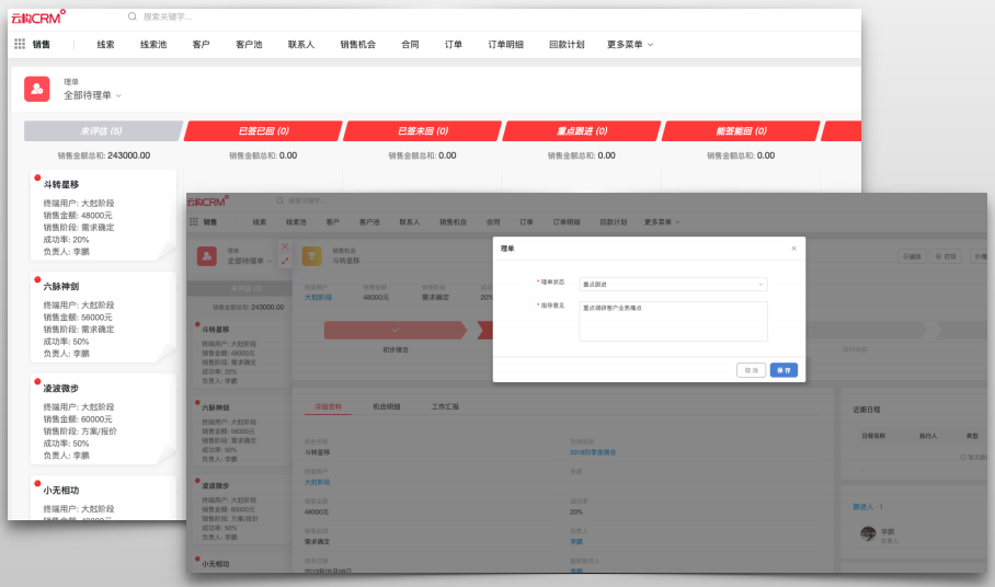 新版本在銷售機會階段推進的過程中加?了“理單”環(huán)節(jié),提供了一個銷售管理者與?線銷售?員?對?評價指導的平臺,管理層可以為銷售?員提供針對性的?作指導,提高銷售成功率,并能更加客觀和準確地做出銷售預測。對于理單條件和理單階段等的自定義設(shè)置,企業(yè)同樣可以在后臺實現(xiàn)。