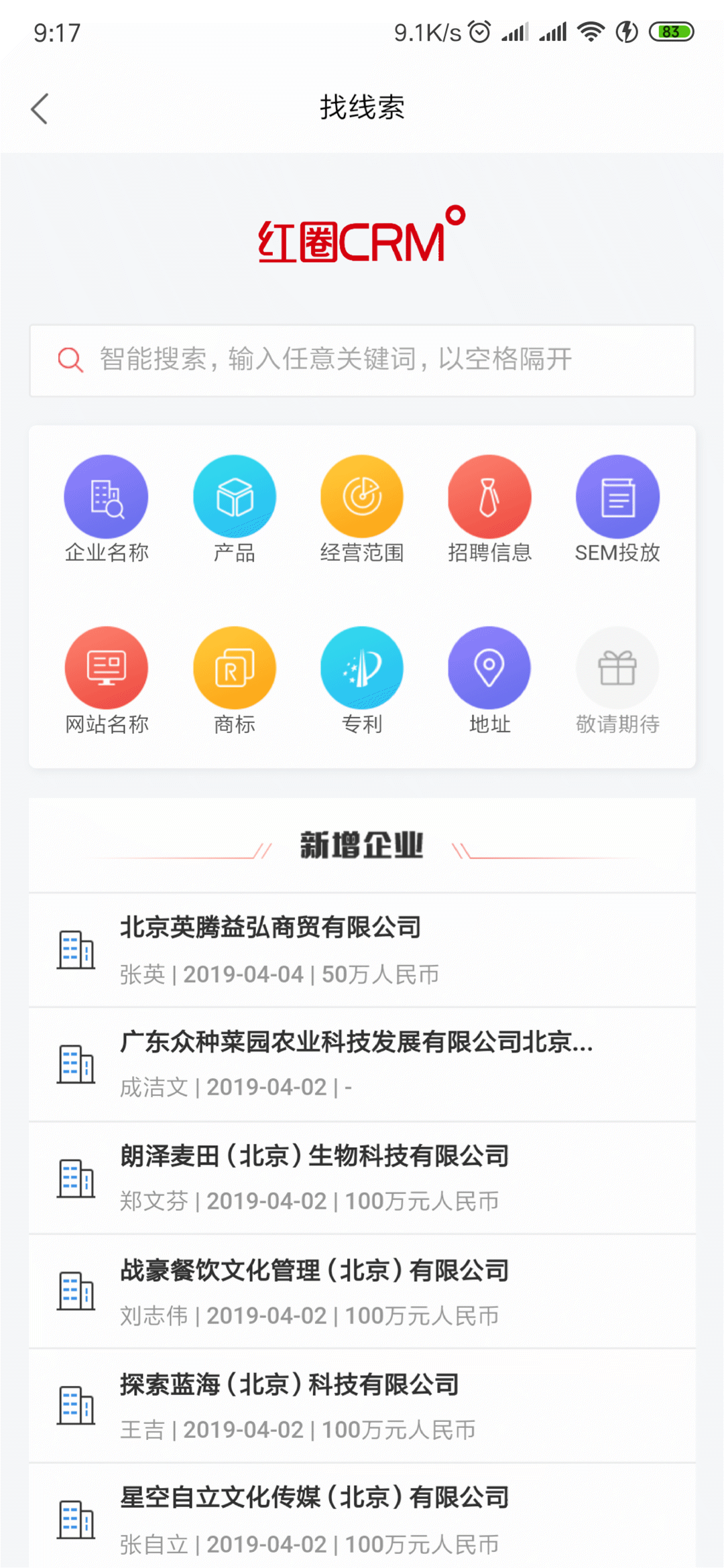 紅圈CRM V1094版本將為企業(yè)解決獲客渠道單?、線索來源不穩(wěn)定的難題,從源頭出發(fā),助力企業(yè)業(yè)績提升。銷售人員在“找線索”頁面輸入關(guān)鍵詞(如企業(yè)名稱、產(chǎn)品、地址、招聘信息等)后,系統(tǒng)能夠基于全網(wǎng)大數(shù)據(jù)信息采集,從海量數(shù)據(jù)中精準、快速地篩選出符合客戶畫像的優(yōu)質(zhì)資源,銷售人員能夠獲取企業(yè)完整信息以及相關(guān)聯(lián)系人、電話等精準信息,并可?鍵轉(zhuǎn)為銷售線索,將重要信息保存到系統(tǒng)中。