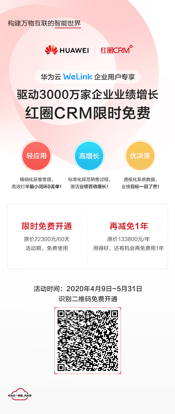 驅(qū)動3000萬家企業(yè)業(yè)績百倍增長——紅圈CRM限時(shí)免費(fèi),#華為云WeLink#企業(yè)用戶專享,更有驚喜0元購活動。