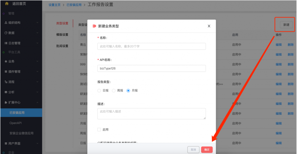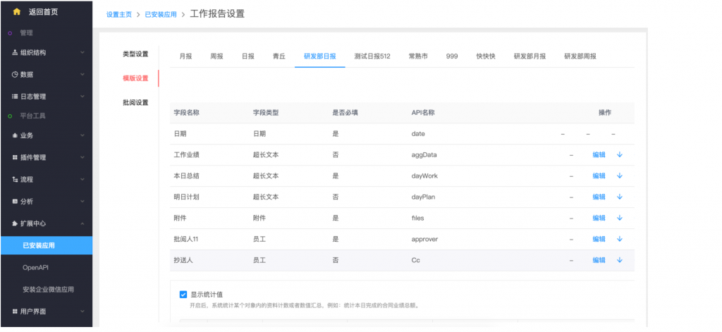 - 后臺設(shè)置:系統(tǒng)設(shè)置——擴展中心——已安裝應(yīng)用——工作報告,類型設(shè)置支持新建類型;在模板設(shè)置中,可以按業(yè)務(wù)類型設(shè)置不同的字段和統(tǒng)計值;統(tǒng)計值設(shè)置,支持自定義名稱;