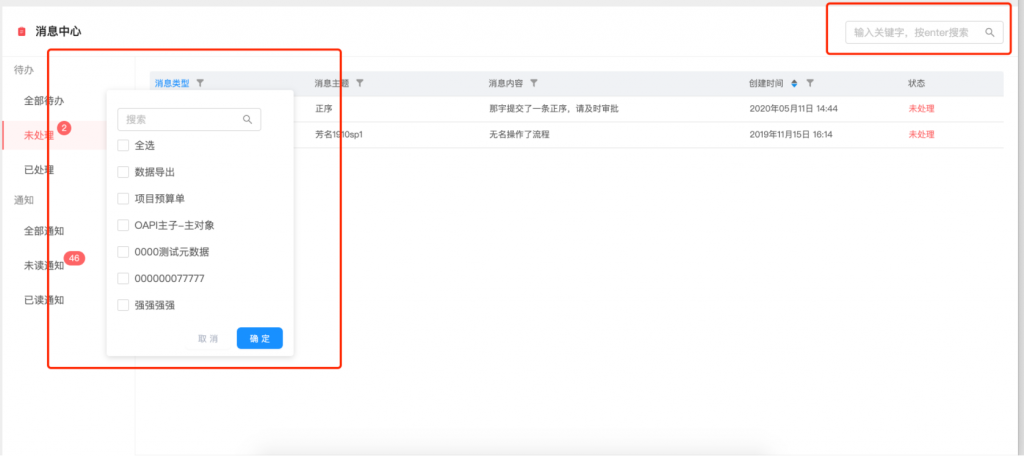 - 消息通知的類型和主題進行了規(guī)范,便于進行分類和篩選;每條消息可明確看到業(yè)務(wù)來源,主題更加清晰,大幅度減少了以“通知”為標題的消息;同時查看或處理變?yōu)檎锌牲c擊;消息支持篩選和搜索,也可以直接搜索內(nèi)容或主題;待辦和通知的狀態(tài)變化更加智能,去除了手動按鈕操作,當處理或查看詳情后,狀態(tài)會自動變化;同時優(yōu)化了紅點顯示數(shù)量的刷新機制,更新更及時.