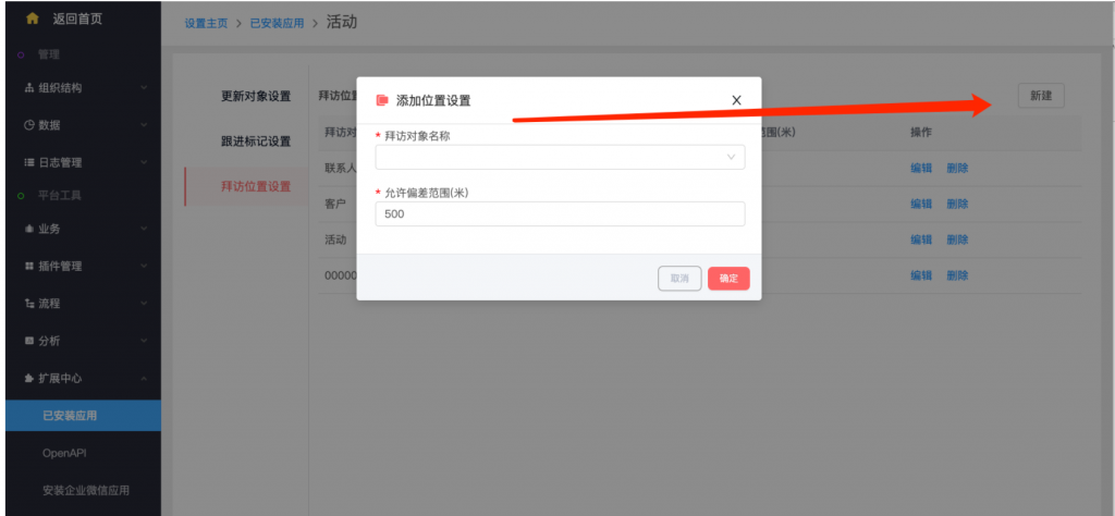 - 系統(tǒng)設(shè)置——擴展中心——已安裝應(yīng)用——活動,增加了“拜訪位置設(shè)置”。新建拜訪位置設(shè)置,選擇拜訪對象、設(shè)置參考字段并設(shè)置允許偏差范圍