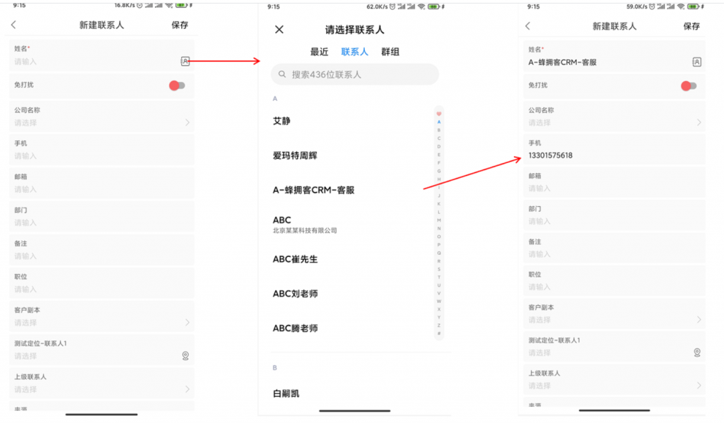 3) 手機端新建聯(lián)系人可以通過手機通訊錄選擇。