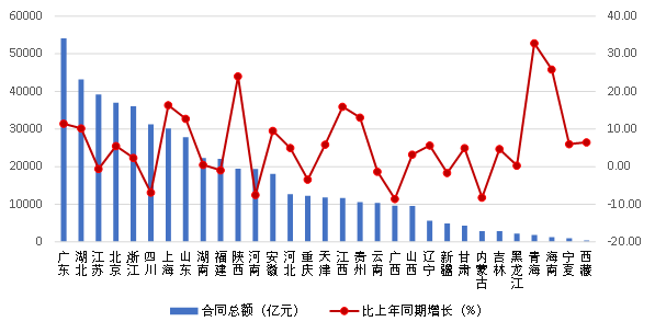 2023年上半年,廣東、湖北、江蘇、北京、浙江、四川、上海等7個地區(qū)建筑業(yè)企業(yè)合同總額均超過30000億元,分別達到54142.75億元、43200.05億元、39176.44億元、37001.58億元、36004.49億元、31243.04億元和30146.28億元。合同總額超過 20000 億元的還有山東、湖南、福建3個地區(qū)。合同總額同比增長最快的是青海,達到了32.80%。海南、陜西、上海和江西的增幅也都超過了15%。9個地區(qū)合同總額出現(xiàn)負增長,其中廣西、內(nèi)蒙古的負增長均超過8%(圖6)。