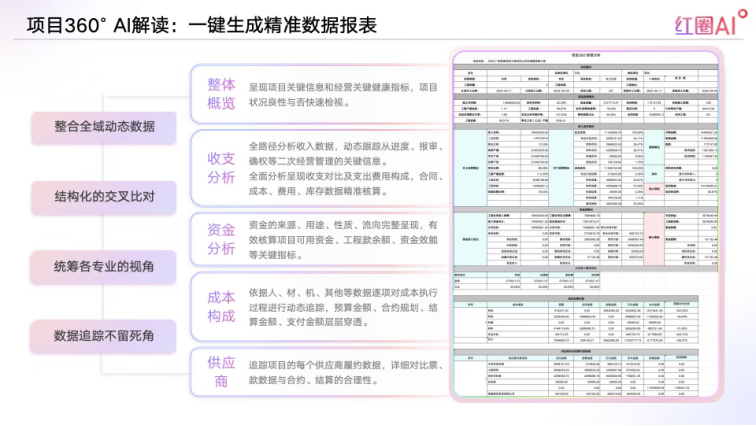 比如項目360°AI解讀,你想了解某個項目的情況,不用再讓下屬寫報告——點一下按鈕,系統(tǒng)自動生成一份“效益體檢報告”:資金夠不夠用?成本有沒有超支?進度是不是滯后?甚至能告訴你“成本超支是因為某分包商頻繁變更合同”,連優(yōu)化建議都給出來。相當于給你配了個“智能參謀”,不用自己扒數據,問題根因、解決方向全清楚。