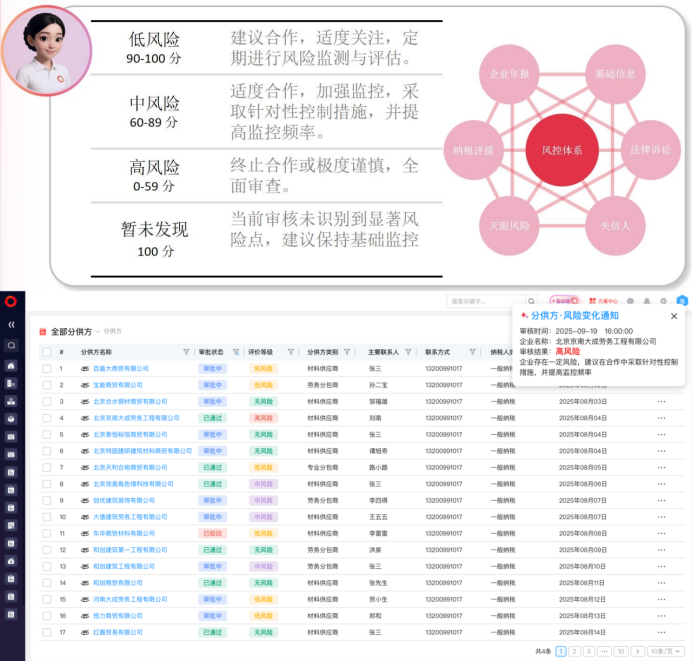 采購助理還支持定期智能排查,自動刷新已合作供應商風險等級,針對高風險供應商及時預警,并可設(shè)置限制合作標準,快速終止合作并系統(tǒng)溯源追查。通過構(gòu)建涵蓋組織架構(gòu)、企業(yè)年報、納稅評級、法律訴訟、天眼風險、失信人等維度的風險矩陣,采購助理為企業(yè)建立起科學、透明、高效的供應商管理體系。