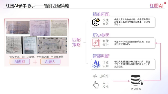 錄單助手還具備智能匹配與成本歸集能力,能智能分析入庫材料匹配的合同明細并掛接,厘清成本發(fā)生源頭,方便后期實際成本精準統(tǒng)計及溯源。其匹配策略包括三重機制:精準匹配(根據(jù)物資名稱、規(guī)格型號校對合同明細)、歷史參照(依據(jù)同一項目歷史數(shù)據(jù)自動匹配)、智能判斷(借助大模型語意識別相似性),確保錄入既快又準。