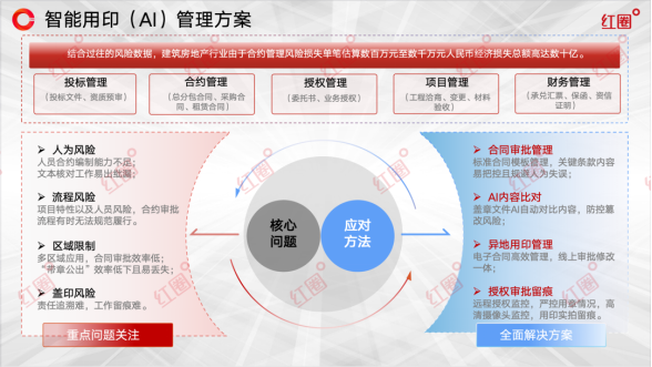 在企業(yè)的運營脈絡(luò)中,印章雖小,卻承載著沉重的法律責(zé)任與經(jīng)濟(jì)風(fēng)險。面對合同協(xié)議繁多、應(yīng)用場景復(fù)雜的業(yè)務(wù)環(huán)境,特別是對于建筑工程類企業(yè)而言,依賴人工管理的傳統(tǒng)用印模式已顯疲態(tài),在風(fēng)險控制與運營效率方面捉襟見肘。基于對建筑行業(yè)數(shù)字化進(jìn)程的深刻洞察,紅圈軟件推出了「智能AI印控一體化解決方案」,旨在以科技創(chuàng)新驅(qū)動管理變革,引領(lǐng)企業(yè)實現(xiàn)用印流程全面、徹底的數(shù)字化與智能化轉(zhuǎn)型。