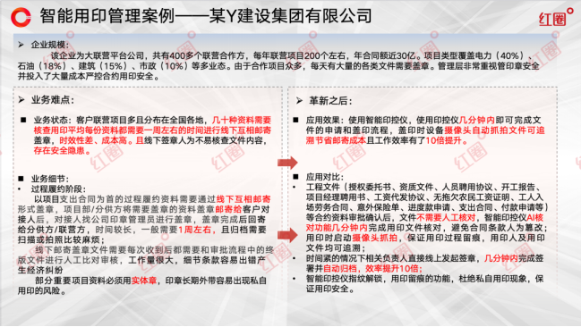 紅圈智能印控一體化解決方案的應(yīng)用,成功幫助企業(yè)實現(xiàn)了從依賴“人防”到依托“技防”的本質(zhì)跨越,帶來了效率與安全的雙重提升。