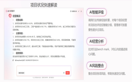你的項(xiàng)目“智能指揮官:面對(duì)一個(gè)復(fù)雜的項(xiàng)目,如何快速抓住經(jīng)營(yíng)全貌?項(xiàng)目360°AI解讀功能,可以整合全維經(jīng)營(yíng)指標(biāo)(資金/成本/合同/付款等),一鍵生成項(xiàng)目全景作戰(zhàn)圖。大模型會(huì)替你深度解讀經(jīng)營(yíng)風(fēng)險(xiǎn)與應(yīng)對(duì)策略,將復(fù)雜數(shù)據(jù)轉(zhuǎn)化為清晰的決策語(yǔ)言。它能調(diào)用行業(yè)專(zhuān)家經(jīng)驗(yàn)對(duì)項(xiàng)目狀況進(jìn)行智能評(píng)級(jí)和經(jīng)營(yíng)分析,針對(duì)問(wèn)題給出改進(jìn)建議,據(jù)測(cè)算能讓經(jīng)營(yíng)決策效率提升10倍。