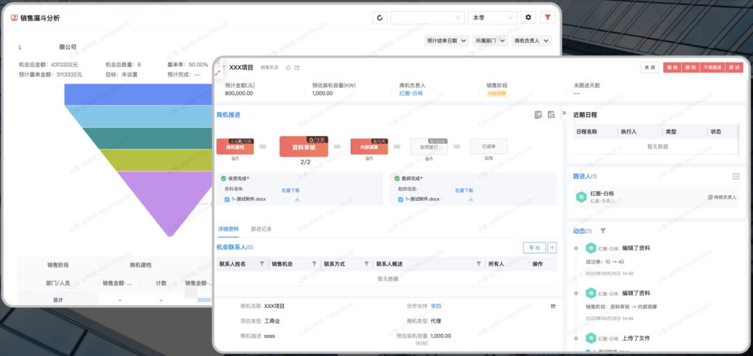 ○ 商機(jī)管理模塊(項(xiàng)目迷霧一掃光): 為公司構(gòu)建項(xiàng)目商機(jī)推進(jìn)轉(zhuǎn)化漏斗,清晰展示各階段項(xiàng)目數(shù)量及分布,幫助管理層快速鎖定需重點(diǎn)關(guān)注的商機(jī),合理調(diào)配資源,加速項(xiàng)目轉(zhuǎn)化。